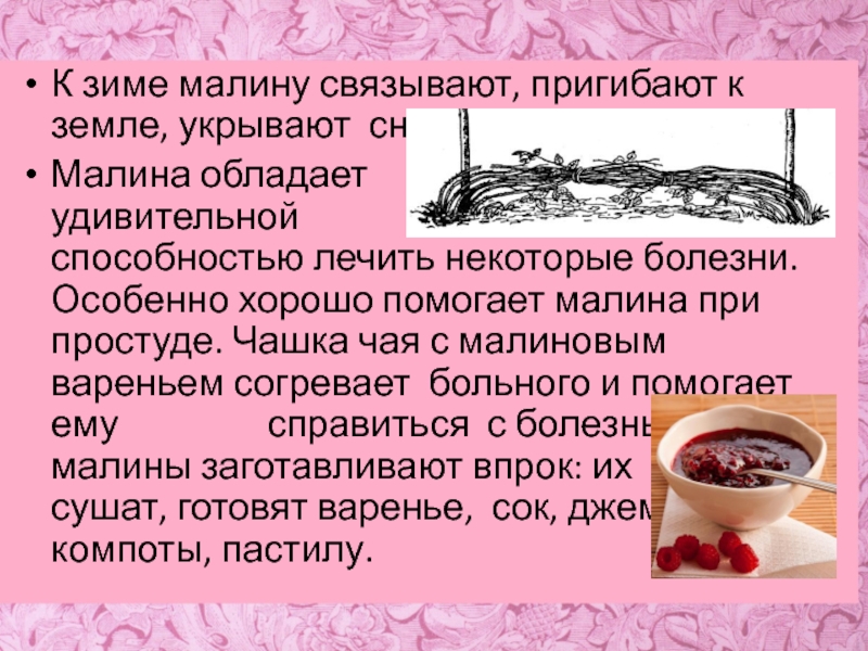 удивительной способностью лечить некоторые болезни. Особенно хорошо помогает малина при простуде. Чашка чая с малиновым вареньем согревает больного и помогает ему справиться с болезнью. Плоды малины заготавливают впрок: их сушат, готовят варенье, сок, джем, компоты, пастилу.