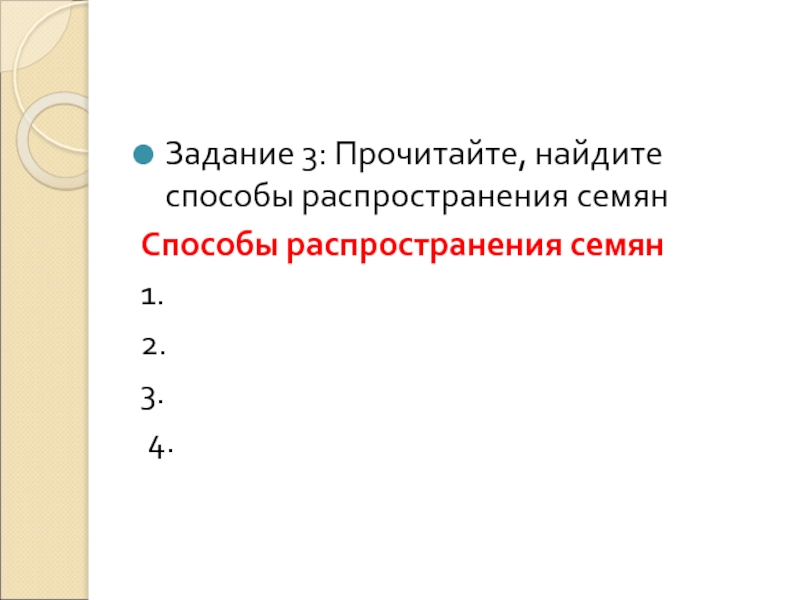 Задание 3: Прочитайте, найдите способы распространения семянСпособы распространения семян1.2.3. 4.