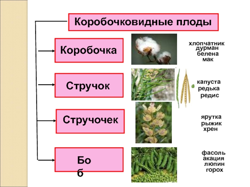 Коробочковидные плодыКоробочкаСтручочекСтручокБобдурманбеленамаккапустаредькаредисяруткахренрыжикгорохфасольакацияхлопчатниклюпин