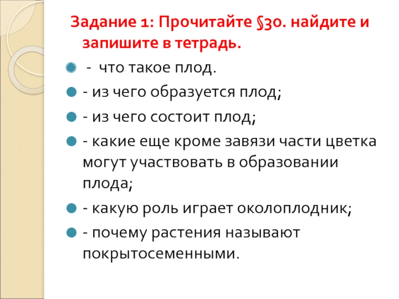 Задание 1: Прочитайте §30. найдите и запишите в тетрадь. - что такое плод.- из чего образуется плод;-