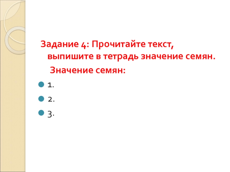 Задание 4: Прочитайте текст, выпишите в тетрадь значение семян.	Значение семян:1. 2. 3.