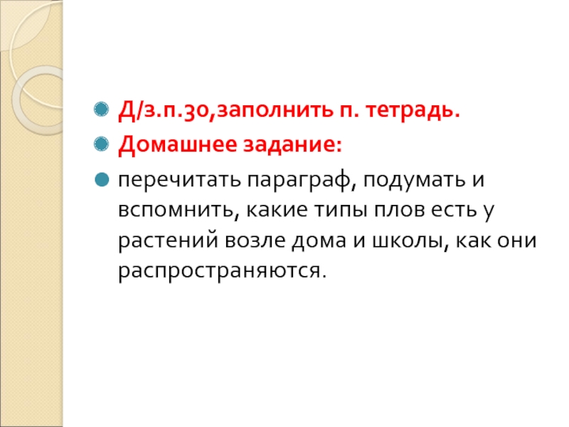 Д/з.п.30,заполнить п. тетрадь.Домашнее задание: перечитать параграф, подумать и вспомнить, какие типы плов есть у растений возле дома