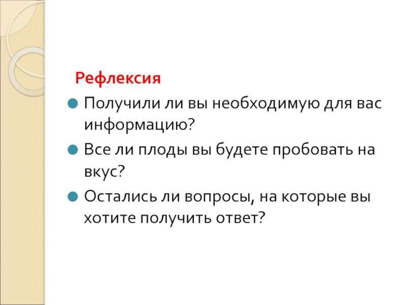 РефлексияПолучили ли вы необходимую для вас информацию?Все ли плоды вы будете пробовать на вкус?Остались ли вопросы,