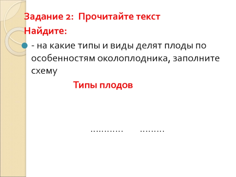 Задание 2: Прочитайте текст Найдите: - на какие типы и виды делят плоды по особенностям околоплодника, заполните