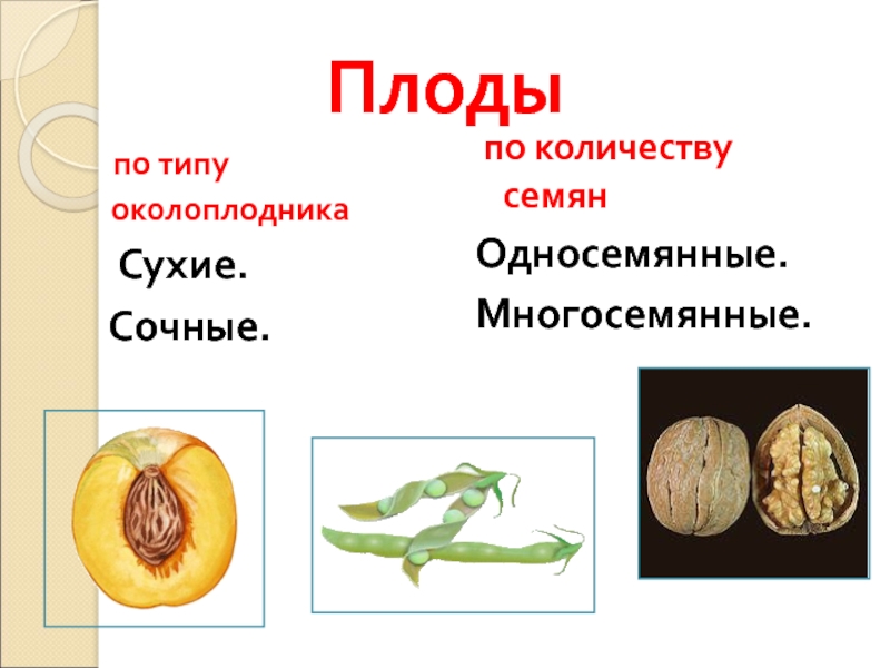 Плоды   по типу околоплодника  Сухие. Сочные. по количеству семянОдносемянные.Многосемянные.