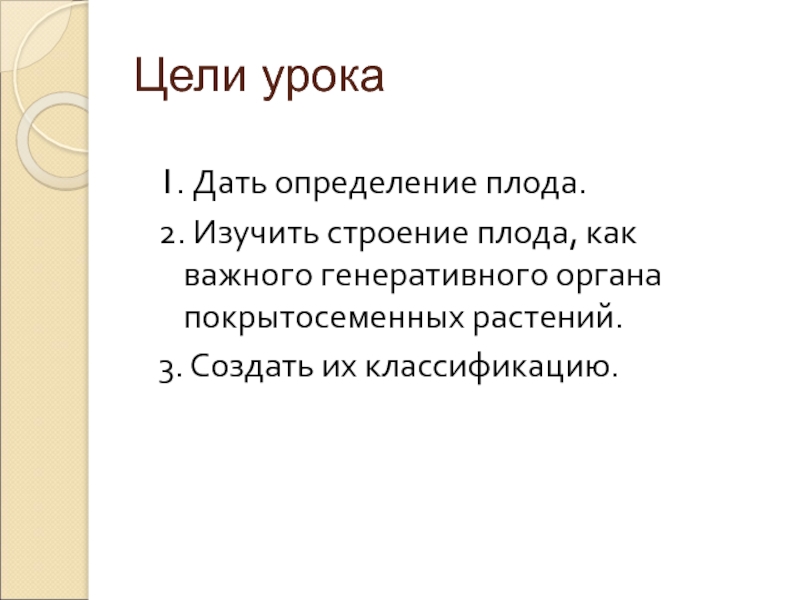 Цели урока1. Дать определение плода.2. Изучить строение плода, как важного генеративного органа покрытосеменных растений.3. Создать их классификацию.