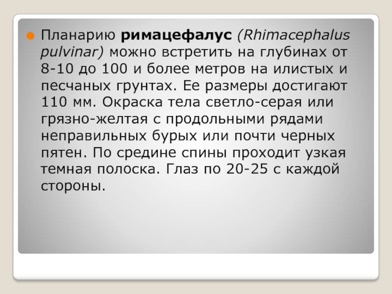 Слайд 8Планарию римацефалус (Rhimacephalus pulvinar) можно встретить на глубинах от 8-10 до 100 и более