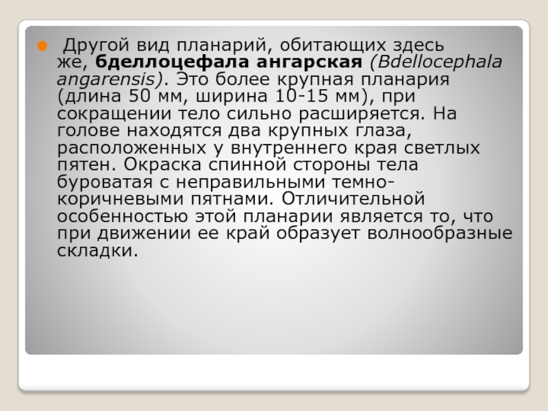 Слайд 6 Другой вид планарий, обитающих здесь же, бделлоцефала ангарская (Bdellоcephala angarensis). Это более крупная