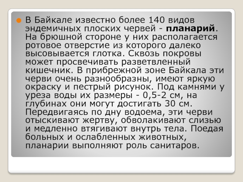 Слайд 2В Байкале известно более 140 видов эндемичных плоских червей - планарий. На