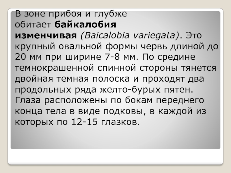В зоне прибоя и глубже обитает байкалобия изменчивая (Baicalobia variegata). Это крупный овальной формы червь длиной до 20 мм