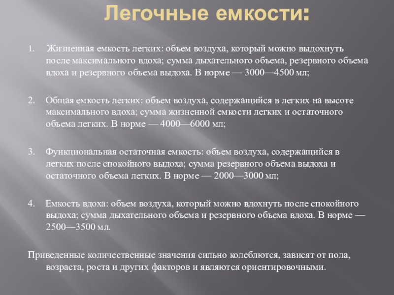 1. Дыхательный объем: объем воздуха, вдыхаемый (или выдыхаемый) при одном