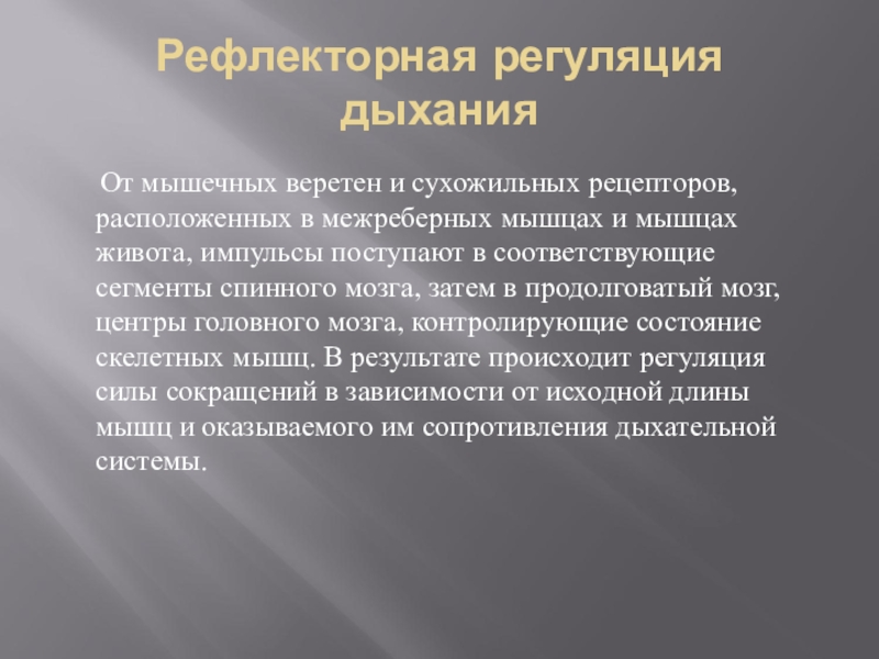 рецепторов, расположенных в межреберных мышцах и мышцах живота, импульсы поступают в соответствующие сегменты спинного мозга, затем в продолговатый мозг, центры головного мозга, контролирующие состояние скелетных мышц. В результате происходит регуляция силы сокращений в зависимости от исходной длины мышц и оказываемого им сопротивления дыхательной системы.