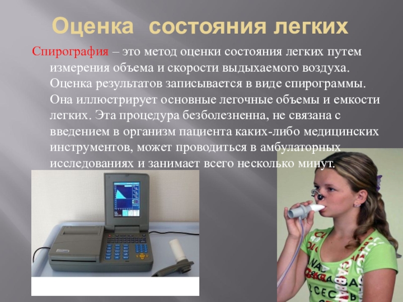 объема и скорости выдыхаемого воздуха. Оценка результатов записывается в виде спирограммы. Она иллюстрирует основные легочные объемы и емкости легких. Эта процедура безболезненна, не связана с введением в организм пациента каких-либо медицинских инструментов, может проводиться в амбулаторных исследованиях и занимает всего несколько минут.
