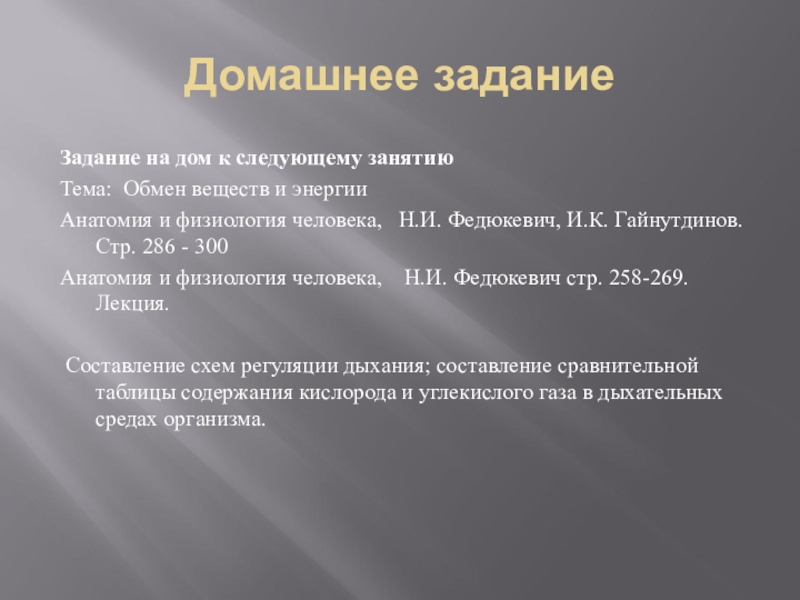 Составление схем регуляции дыхания; составление сравнительной таблицы содержания кислорода и углекислого газа в дыхательных средах организма.