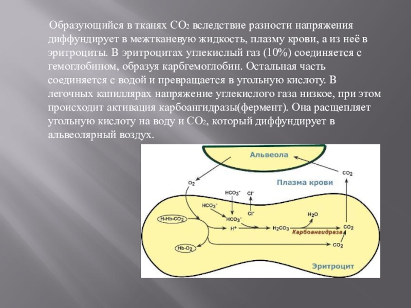 диффундирует в межтканевую жидкость, плазму крови, а из неё в эритроциты. В эритроцитах углекислый газ (10%) соединяется с гемоглобином, образуя карбгемоглобин. Остальная часть соединяется с водой и превращается в угольную кислоту. В легочных капиллярах напряжение углекислого газа низкое, при этом происходит активация карбоангидразы(фермент). Она расщепляет угольную кислоту на воду и СО2, который диффундирует в альвеолярный воздух.