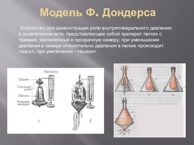 акте, представляющее собой препарат легких с трахеей, заключенный в прозрачную камеру; при уменьшении давления в камере относительно давления в легких происходит «вдох», при увеличении - «выдох».