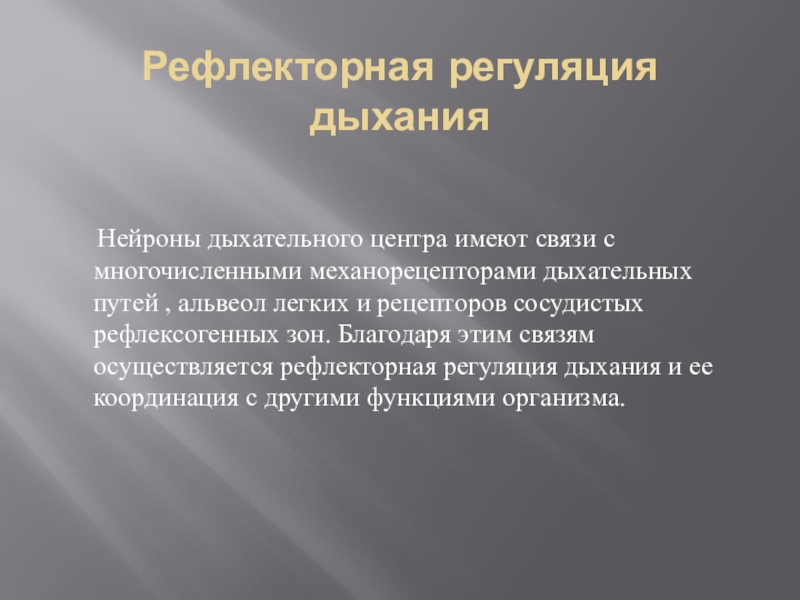 многочисленными механорецепторами дыхательных путей , альвеол легких и рецепторов сосудистых рефлексогенных зон. Благодаря этим связям осуществляется рефлекторная регуляция дыхания и ее координация с другими функциями организма.