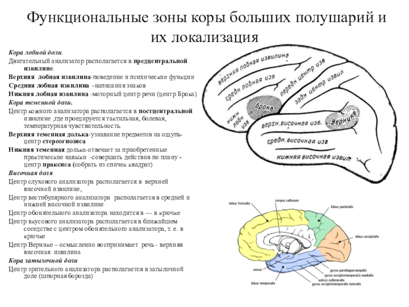 Слайд 21Функциональные зоны коры больших полушарий и их локализация