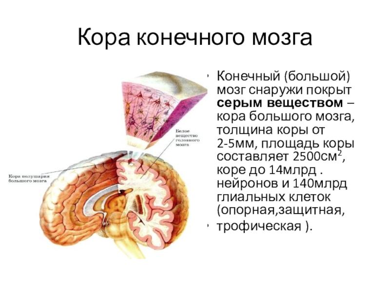 толщина коры от 2-5мм, площадь коры составляет 2500см2, коре до 14млрд .нейронов и 140млрд глиальных клеток (опорная,защитная,
