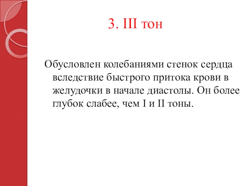 Обусловлен колебаниями стенок сердца вследствие быстрого притока крови в желудочки в начале диастолы. Он более глубок слабее, чем I и II тоны.