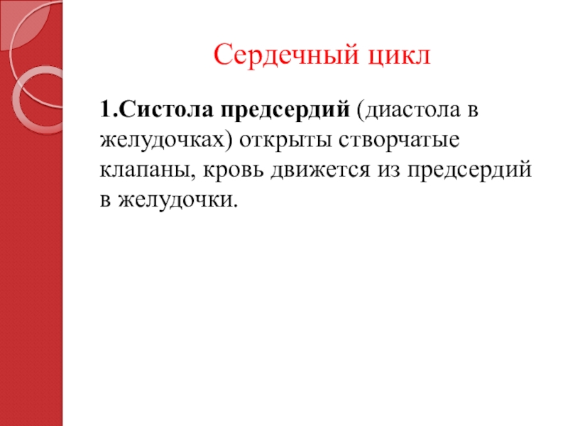 1.Систола предсердий (диастола в желудочках) открыты створчатые клапаны, кровь движется