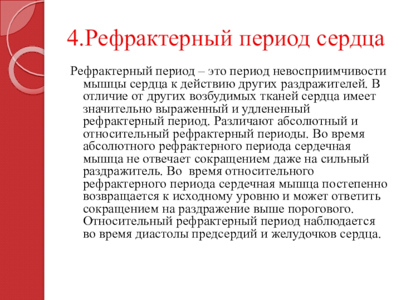 действию других раздражителей. В отличие от других возбудимых тканей сердца имеет значительно выраженный и удлененный рефрактерный период. Различают абсолютный и относительный рефрактерный периоды. Во время абсолютного рефрактерного периода сердечная мышца не отвечает сокращением даже на сильный раздражитель. Во время относительного рефрактерного периода сердечная мышца постепенно возвращается к исходному уровню и может ответить сокращением на раздражение выше порогового. Относительный рефрактерный период наблюдается во время диастолы предсердий и желудочков сердца.