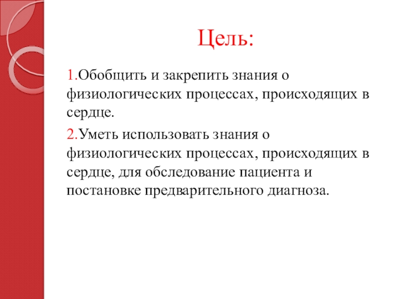 1.Обобщить и закрепить знания о физиологических процессах, происходящих в сердце.