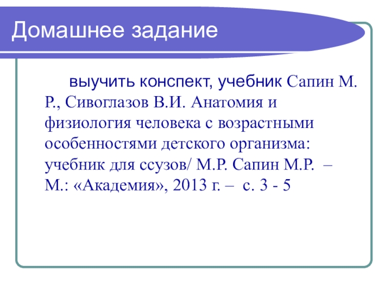 человека с возрастными особенностями детского организма: учебник для ссузов/ М.Р. Сапин М.Р. – М.: «Академия», 2013 г. – с. 3 - 5