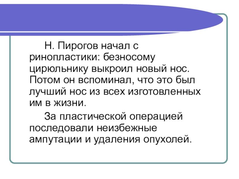 Н. Пирогов начал с ринопластики: безносому цирюльнику выкроил новый нос. Потом он