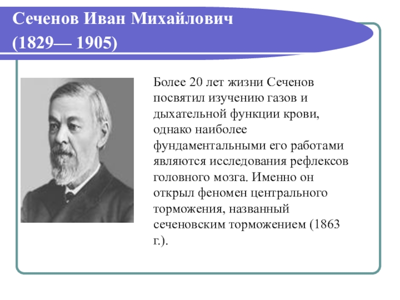 изучению газов и дыхательной функции крови, однако наиболее фундаментальными его работами являются исследования рефлексов головного мозга. Именно он открыл феномен центрального торможения, названный сеченовским торможением (1863 г.).