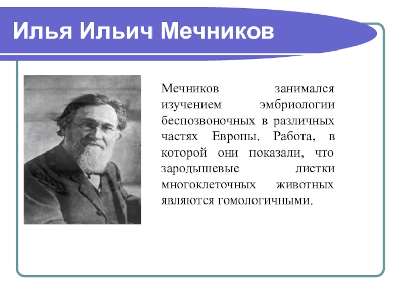 Мечников занимался изучением эмбриологии беспозвоночных в различных частях