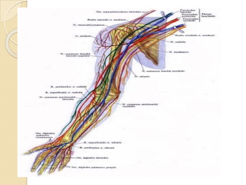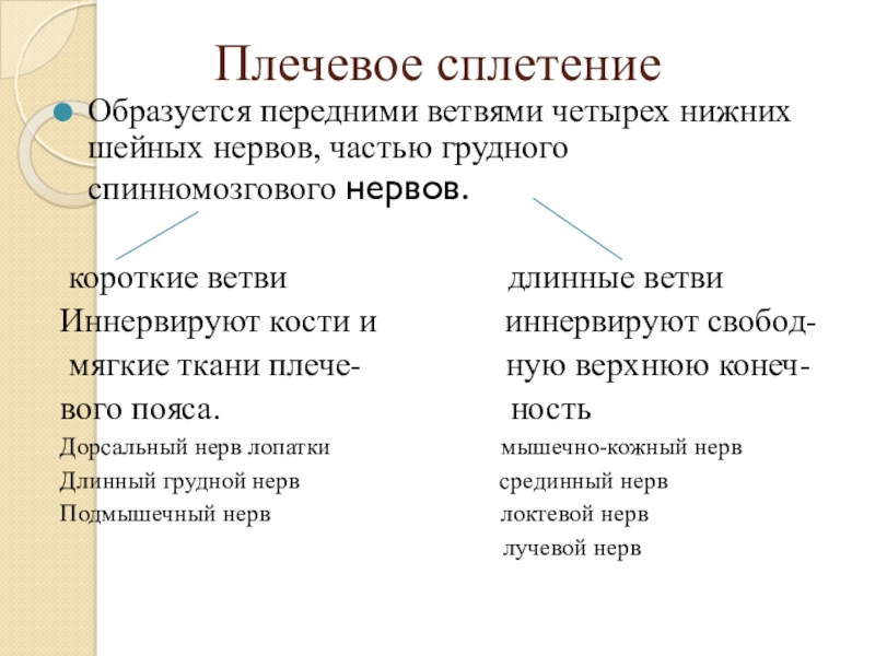 Плечевое сплетениеОбразуется передними ветвями четырех нижних шейных нервов, частью грудного спинномозгового нервов.   короткие ветви