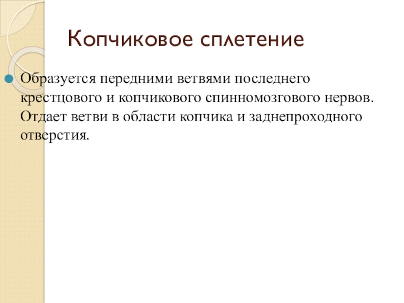 Копчиковое сплетениеОбразуется передними ветвями последнего крестцового и копчикового спинномозгового нервов. Отдает ветви в области копчика и заднепроходного