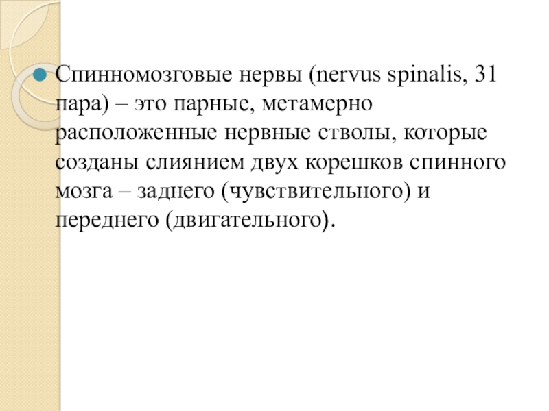 Слайд 2Спинномозговые нервы (nervus spinalis, 31 пара) – это парные, метамерно расположенные