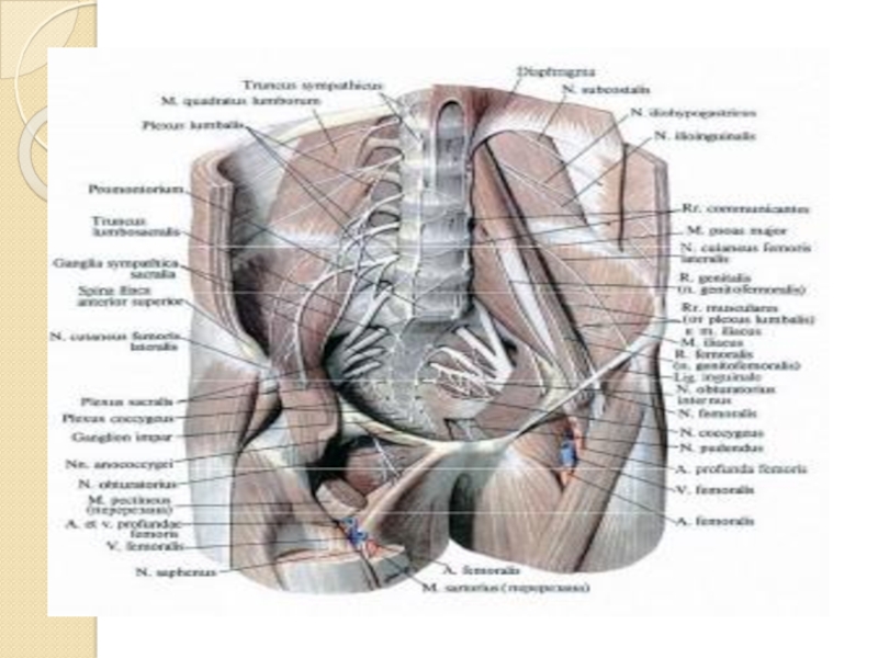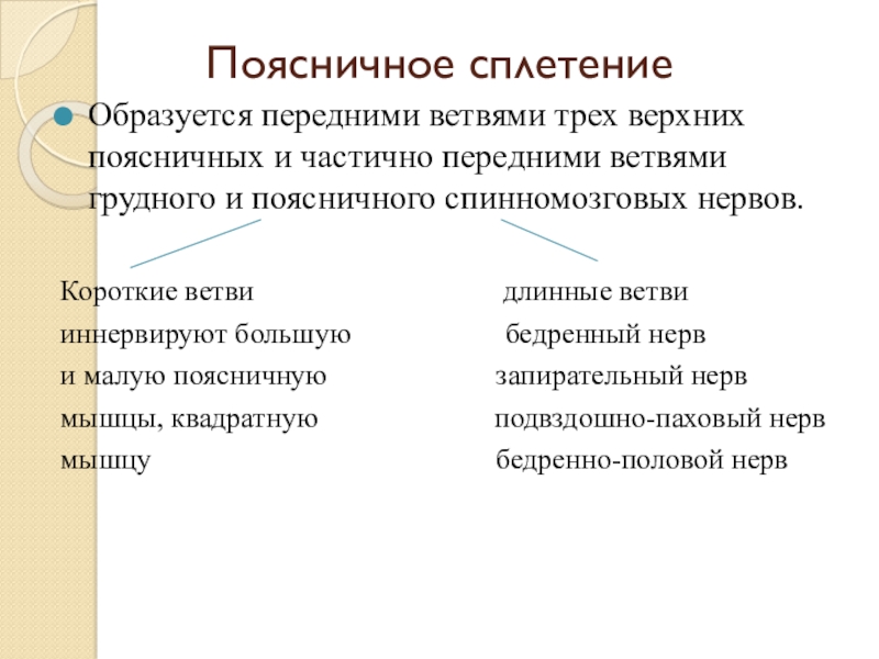 Поясничное сплетениеОбразуется передними ветвями трех верхних поясничных и частично передними ветвями грудного и поясничного спинномозговых нервов.Короткие ветви