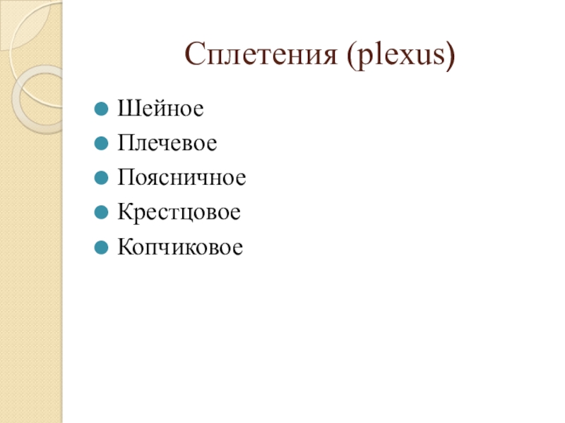Сплетения (plexus)ШейноеПлечевоеПоясничноеКрестцовоеКопчиковое