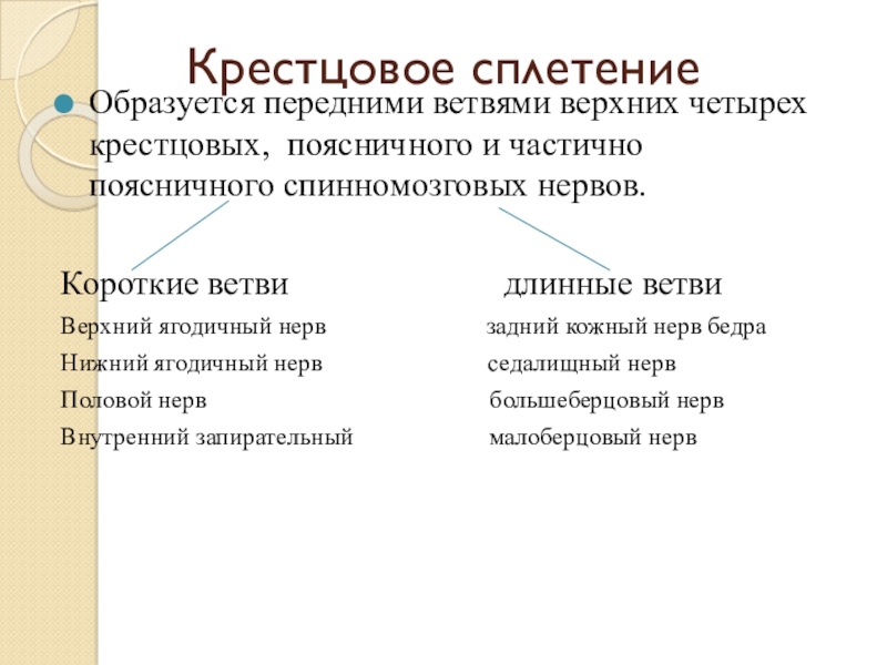 Крестцовое сплетениеОбразуется передними ветвями верхних четырех крестцовых, поясничного и частично поясничного спинномозговых нервов. Короткие ветви