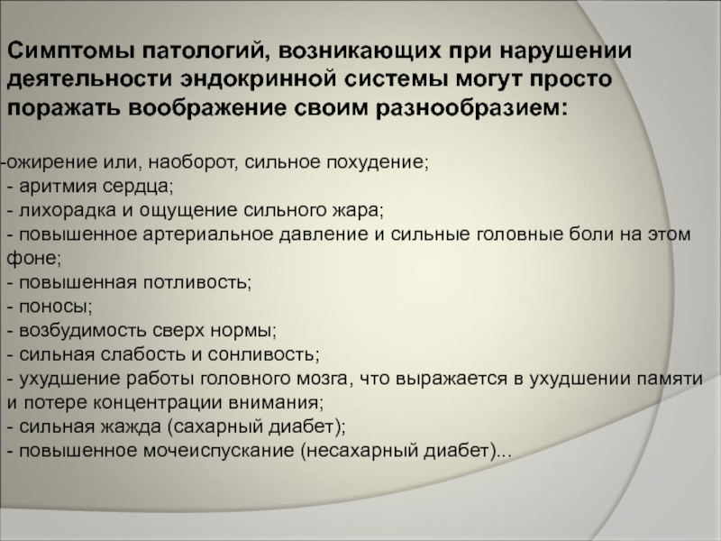 Слайд 3Симптомы патологий, возникающих при нарушении деятельности эндокринной системы могут просто поражать