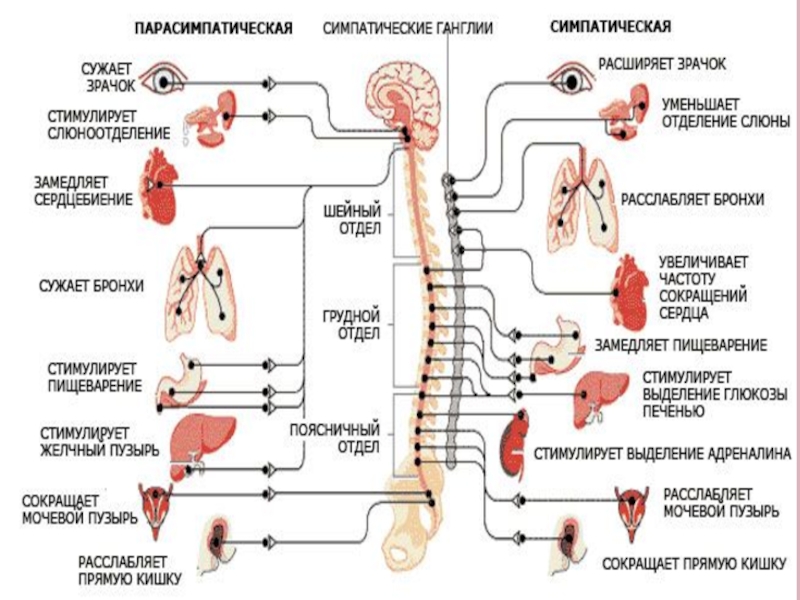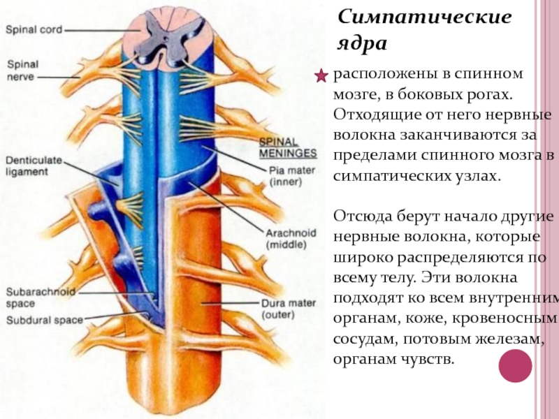 симпатический ствол с его узлами (ганглиями), межузловыми и соединительными ветвями и симпатическими нервами;
