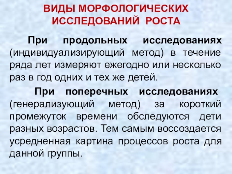 При поперечных исследованиях (генерализующий метод) за короткий промежуток времени обследуются дети разных возрастов. Тем самым воссоздается усредненная картина процессов роста для данной группы.