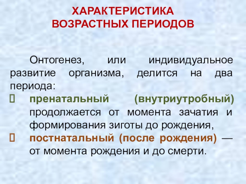 постнатальный (после рождения) — от момента рождения и до смерти.