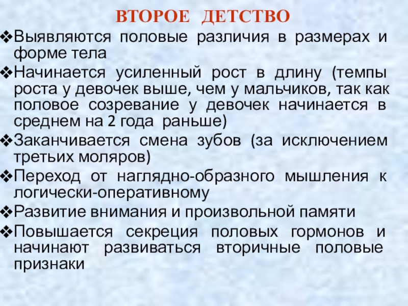 рост в длину (темпы роста у девочек выше, чем у мальчиков, так как половое созревание у девочек начинается в среднем на 2 года раньше)