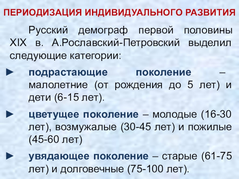Слайд 9ПЕРИОДИЗАЦИЯ ИНДИВИДУАЛЬНОГО РАЗВИТИЯ