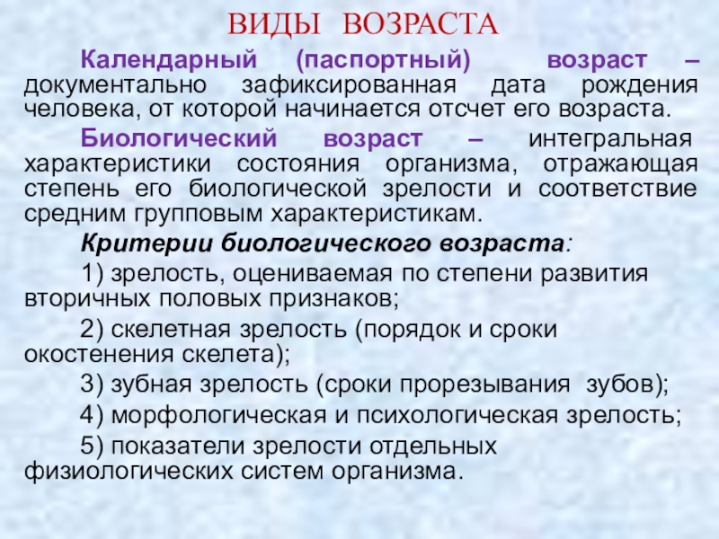 Биологический возраст – интегральная характеристики состояния организма, отражающая степень его биологической зрелости и соответствие средним групповым характеристикам.