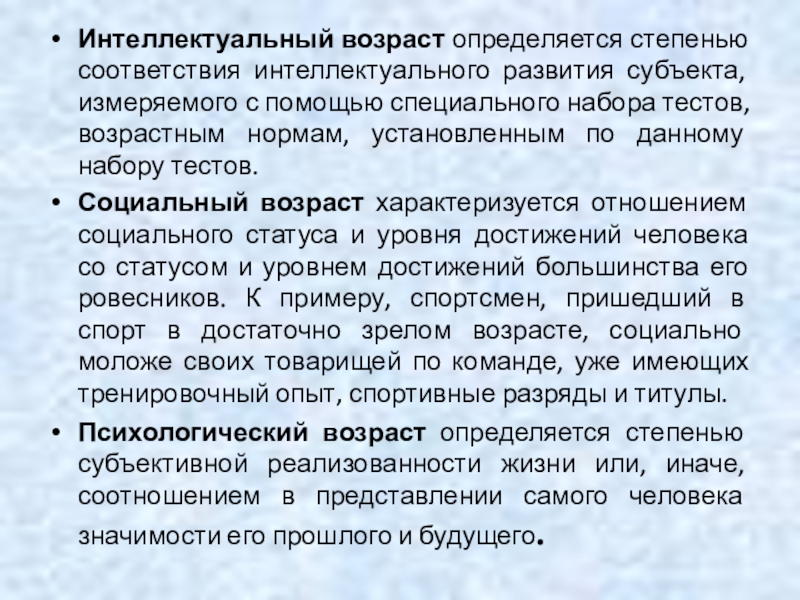 Слайд 31Интеллектуальный возраст определяется степенью соответствия интеллектуального развития субъекта, измеряемого с помощью
