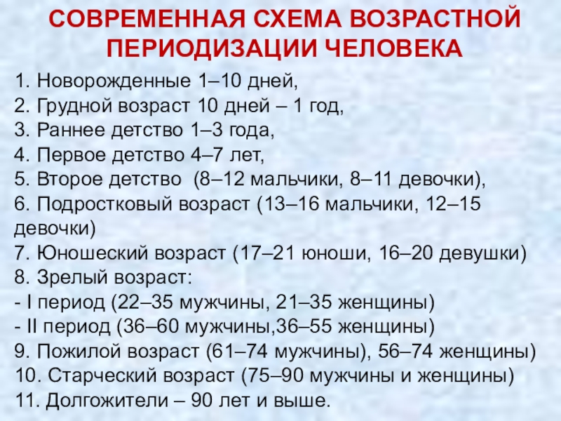 Слайд 12СОВРЕМЕННАЯ СХЕМА ВОЗРАСТНОЙ ПЕРИОДИЗАЦИИ ЧЕЛОВЕКА