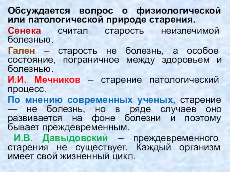 По мнению современных ученых, старение — не болезнь, но в ряде случаев оно развивается на фоне болезни и поэтому бывает преждевременным.