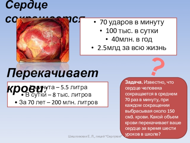 Задача. Известно, что сердце человека сокращается в среднем 70 раз в минуту, при каждом сокращении выбрасывая около 150 см3. крови. Какой объем крови перекачивает ваше сердце за время шести уроков в школе?