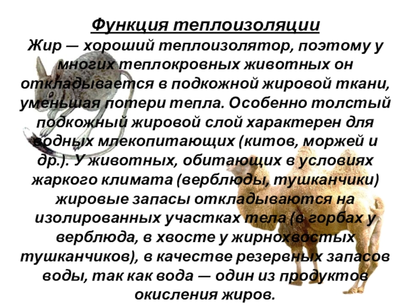 откладывается в подкожной жировой ткани, уменьшая потери тепла. Особенно толстый подкожный жировой слой характерен для водных млекопитающих (китов, моржей и др.). У животных, обитающих в условиях жаркого климата (верблюды, тушканчики) жировые запасы откладываются на изолированных участках тела (в горбах у верблюда, в хвосте у жирнохвостых тушканчиков), в качестве резервных запасов воды, так как вода — один из продуктов окисления жиров.