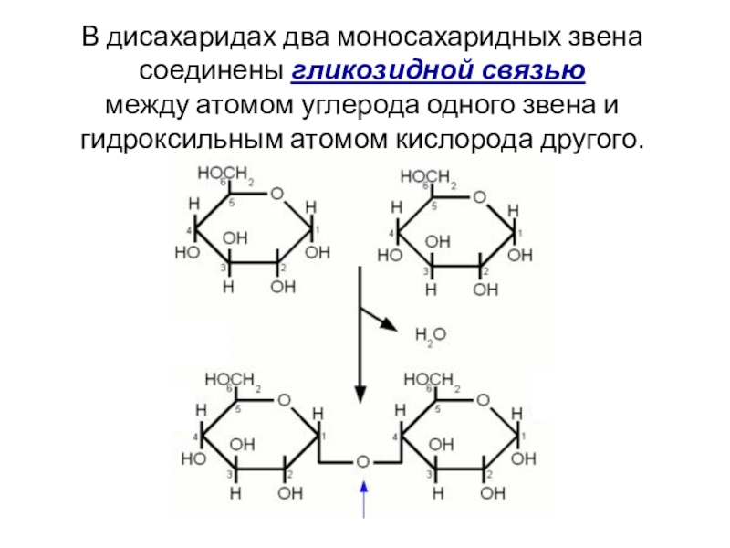 Слайд 7В дисахаридах два моносахаридных звена соединены гликозидной связью